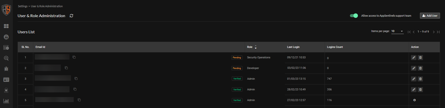 - The maximum number of users that can be added depends on the AppSentinels license SKU. SKUs can be upgraded at any time. Reach out to the Customer Support team at support@appsentinels.ai for more details.