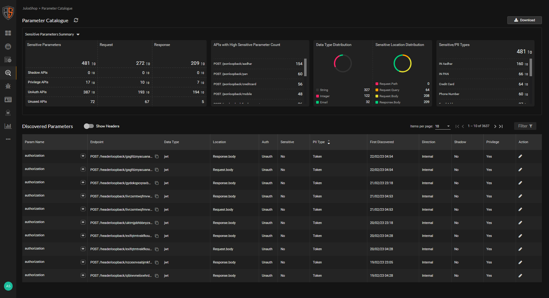 Parameter catalogue provides complete visibility into the sensitive data exposure in the APIs discovered for the protected application.AppSentinels PII detector catalogs the parameters in the APIs that deal with sensitive or PII data.
