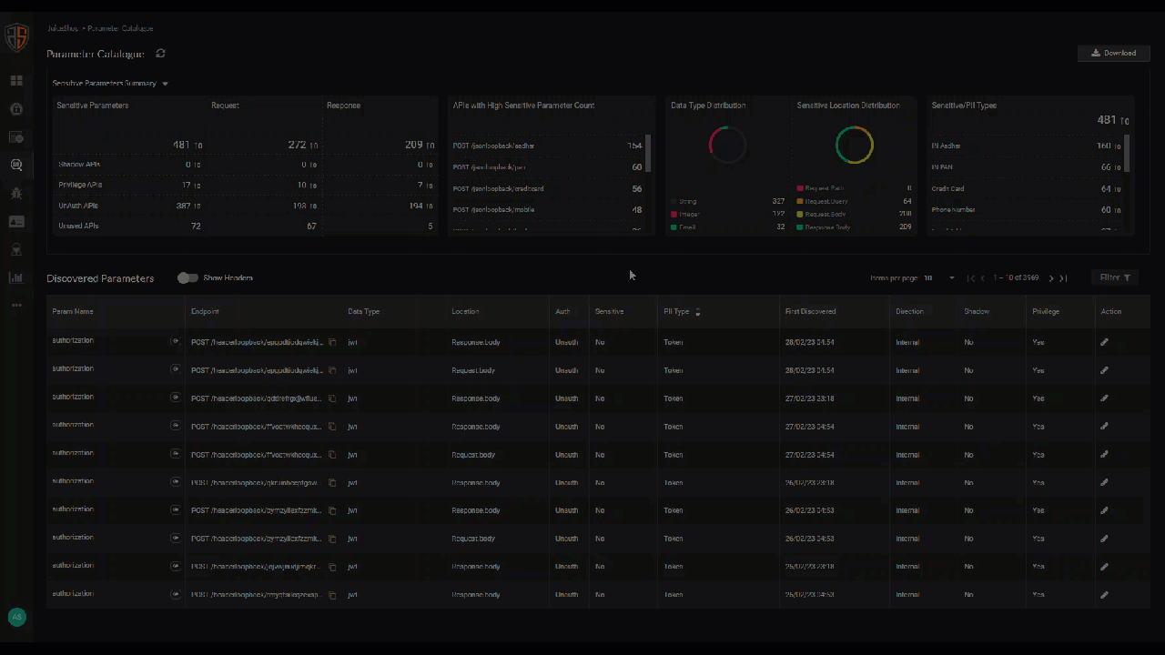 Filtering the catalogue using a Summary widget sets the Advanced filter to the criteria for the legend or data you click on the widget. Using the Advanced filters on top of the filtering criteria set by the widget filters the catalogue further. For example, clicking the Unauthenticated APIs response count in the Sensitive Parameters widget and setting the Advanced filter PII Type = Email Address filters the catalogue to show APIs that are sending email addresses without using any authentication. |