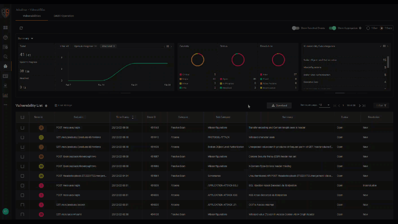 By default, the Show Aggregation switch is set to ON, and the vulnerabilities list is aggregated—a vulnerability seen in multiple APIs is listed only once with the count of APIs in which it is found in the Severity column.