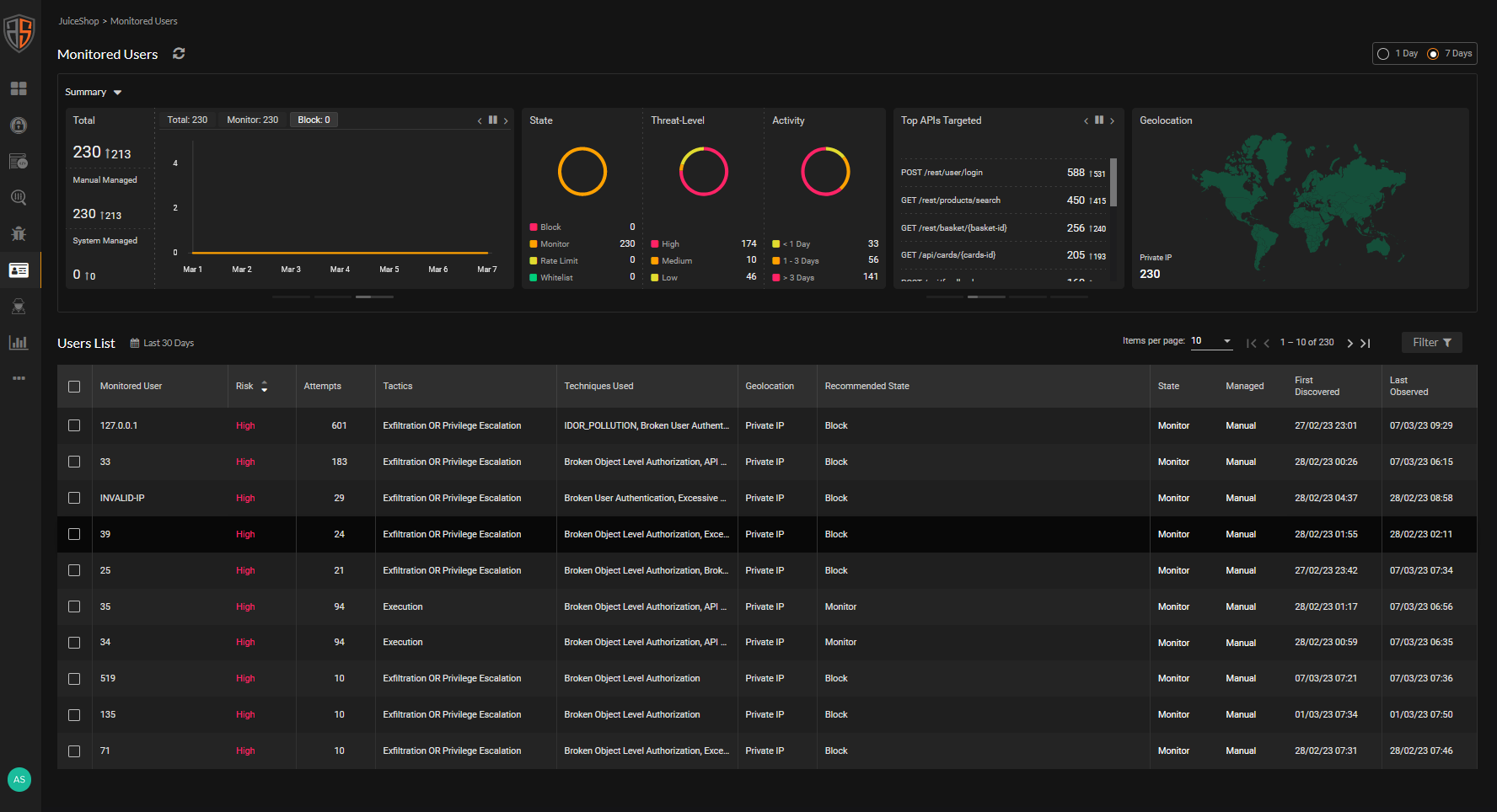 Summary view is a collection of widgets with User State, Threat-Level, Activity, Attack Tactics, and other statistics. Monitored Users view is a listing of the application users with their user ID, state, threat level, geolocation, and other operational data. |