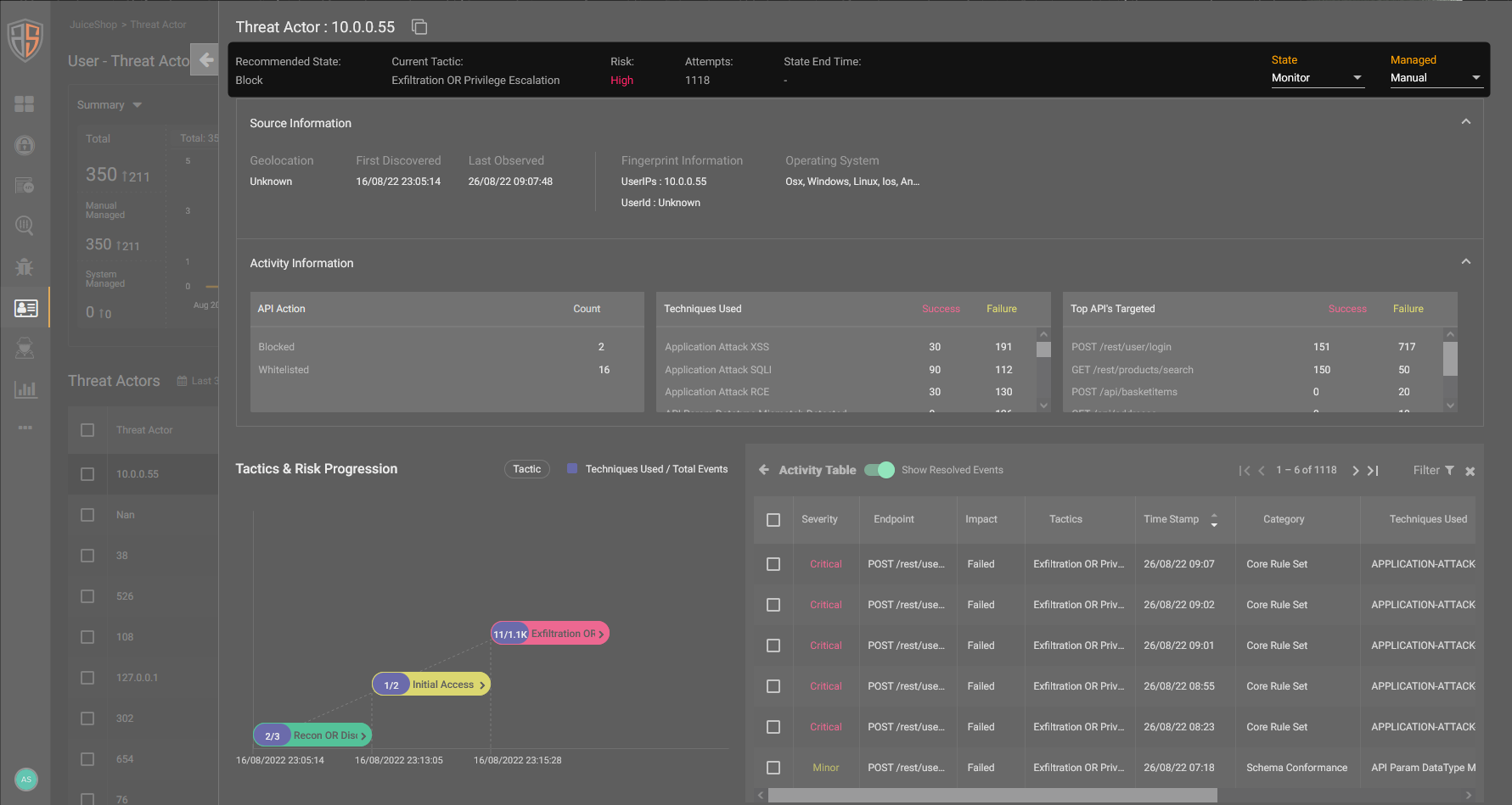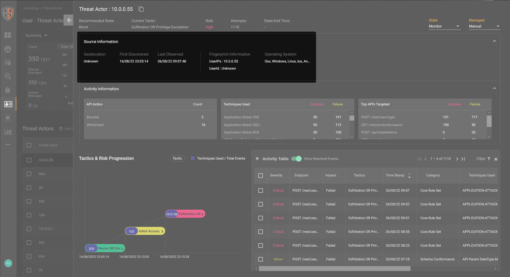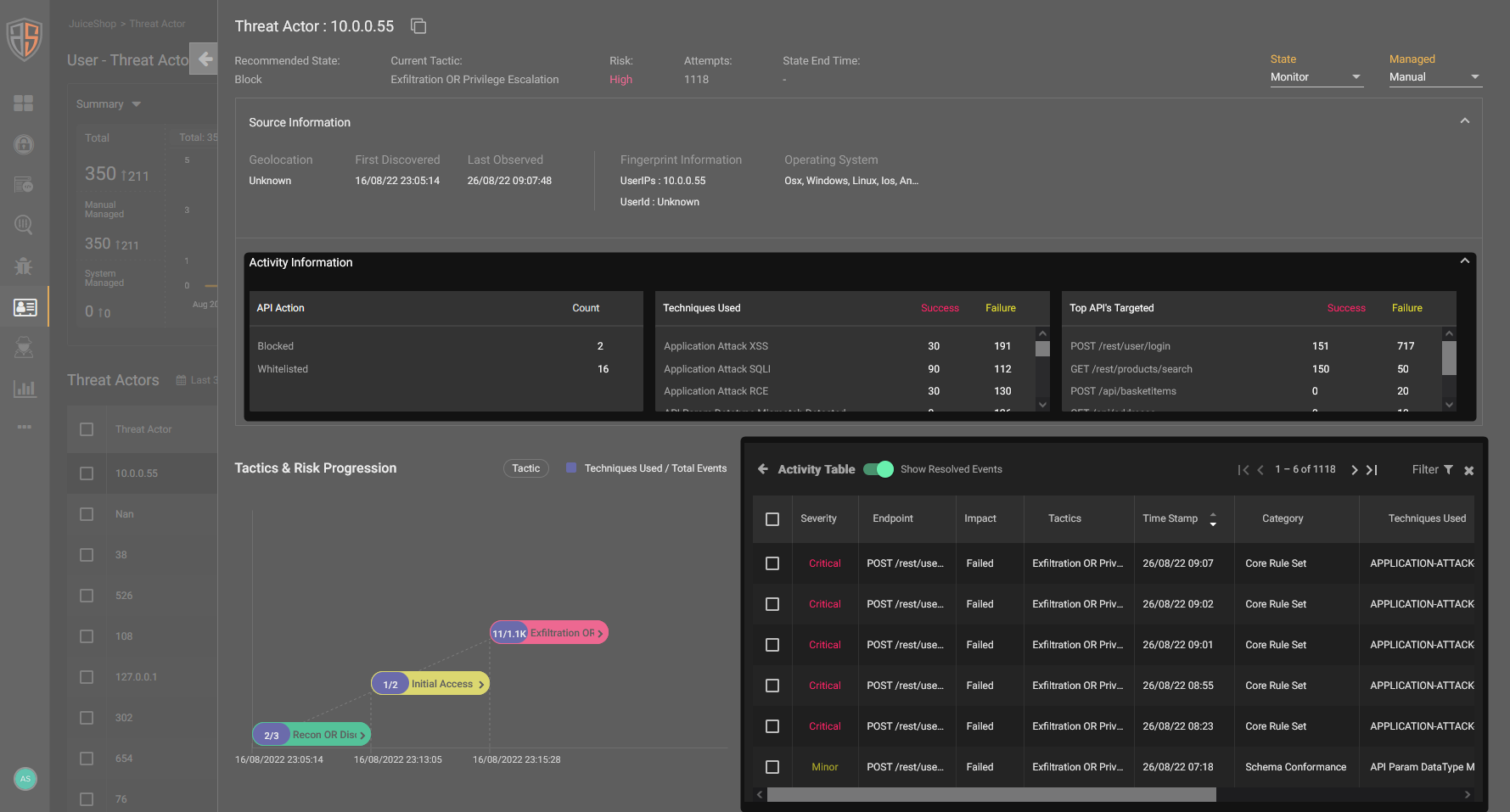 In the Activity Information area, a summary of the threat activities is listed by API action, Attack techniques used and their success state, and the Top 10 APIs targeted and their success rate. A detailed list of the activities, along with the severity, impact, tactic, category, and technique, can be seen in the Activity Table. |